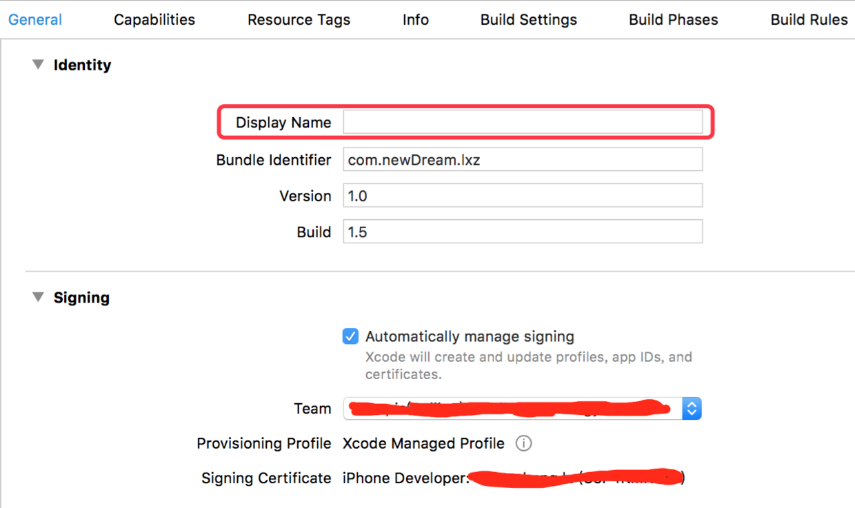 从上面图中可以看到,苹果帮我们自动管理了证书和配置文件。而且在之前的项目中,如果想要设置安装后显示在手机上的App名字,还需要自己到Info.plist文件中,修改Display Name字段,而现在直接在General中就可以做修改,这个修改和Info.plist是同步的。