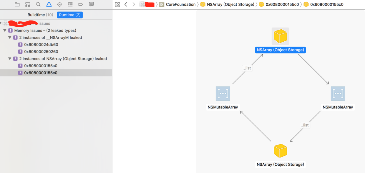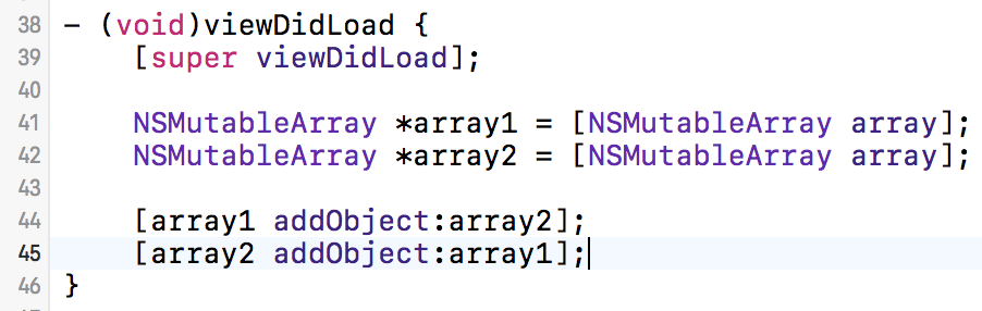 在开发过程中,因为语法或明显的代码错误(例如Retain Cycle),编译器可以发现并报黄色或红色警告。但是一些因为代码逻辑导致的错误,编译器并没有办法找到。例如下面的这句代码,因为代码逻辑的问题导致两个数组相互引用,都不能释放。